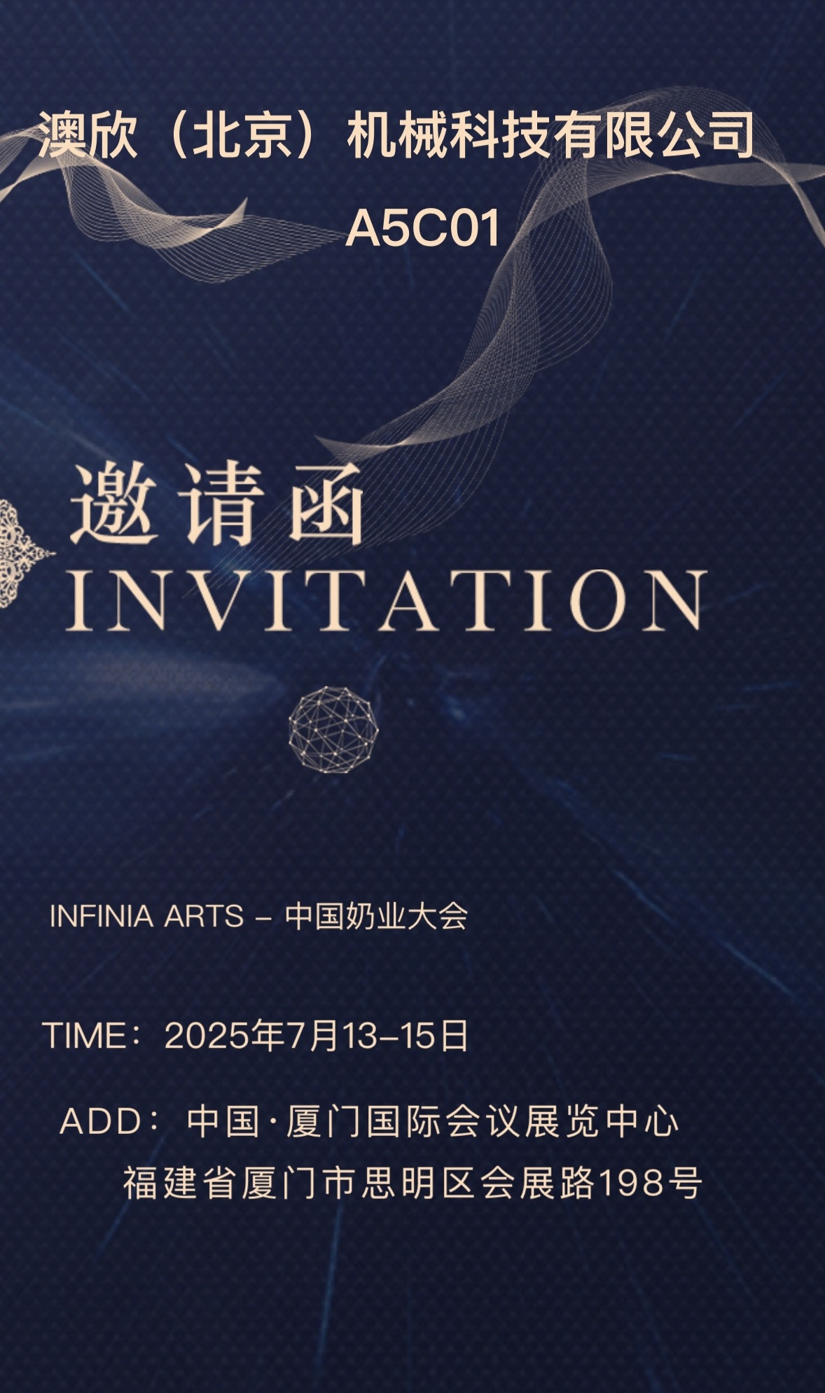 澳欣(北京)機(jī)械科技有限公司一直致力于為奶業(yè)提供先進(jìn)的機(jī)械設(shè)備與技術(shù)解決方案,推動(dòng)奶業(yè)的智能化、無人化、高效化發(fā)展。此次展會(huì),我們將攜眾多創(chuàng)新產(chǎn)品與技術(shù)亮相,全方位展示公司在奶業(yè)機(jī)械領(lǐng)域的研發(fā)成果與實(shí)力,為您帶來全新的行業(yè)體驗(yàn)。我們的展位號(hào)是A5C01,誠邀您蒞臨展位,與我們面對(duì)面交流,共商合作,共謀發(fā)展大計(jì),一同探討奶業(yè)發(fā)展新方向,攜手共創(chuàng)奶業(yè)新輝煌 !